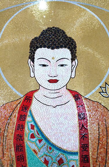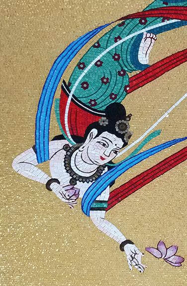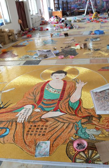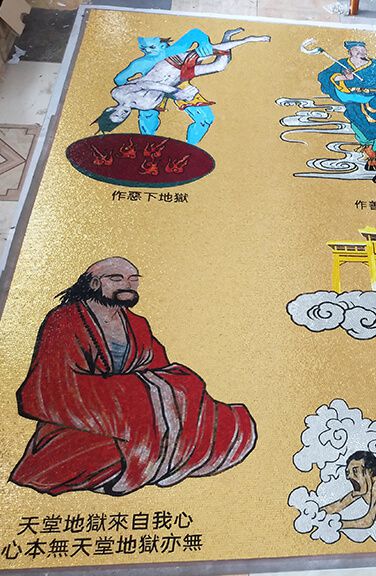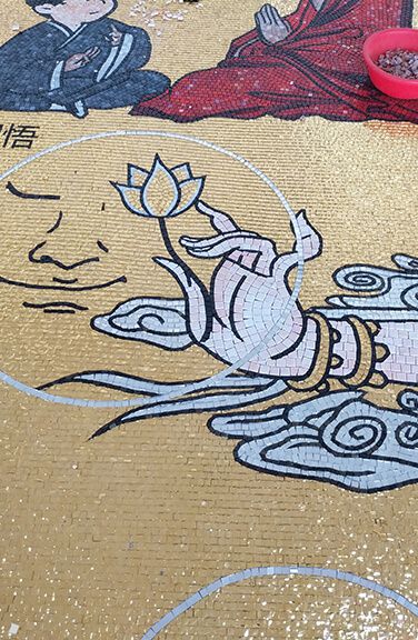 由手工一個一個黏上去建造而成的媽祖金殿,不只黏上去,還需要使用個體大小相同的馬賽克磁磚細心拼貼。